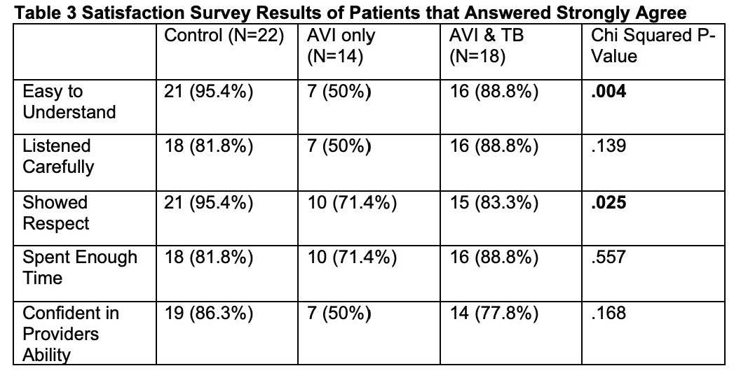 Results: 75 patients completed the study with 31 (41.3%) in the control group, 19 (25.3%) in the AVI only group, & 25 (33.3%) in the AVI w/ TB group. Demographics are shown in Table 1. Mean age was 56.7 years. The mean A-REALM was 61.83 which equated with a high school HL. Among the patients with >75% concordance between their responses & the provider's note, there was no difference across the three AVI groups in any of the categories evaluated: reason for visit, medication changes, & referrals (Table 2). Of the 54 patients that completed the satisfaction survey, more patients in the control group responded 'strongly agree' to "the doctor was easy to understand" & "the doctor spent enough time with me" (Table 3). The mean FK readability scores were significantly better in the control group than the intervention groups (p < 0.001). Of the patients that were provided personalized AVI only 55% acknowledged receiving them & of those 70% endorsed reading them.