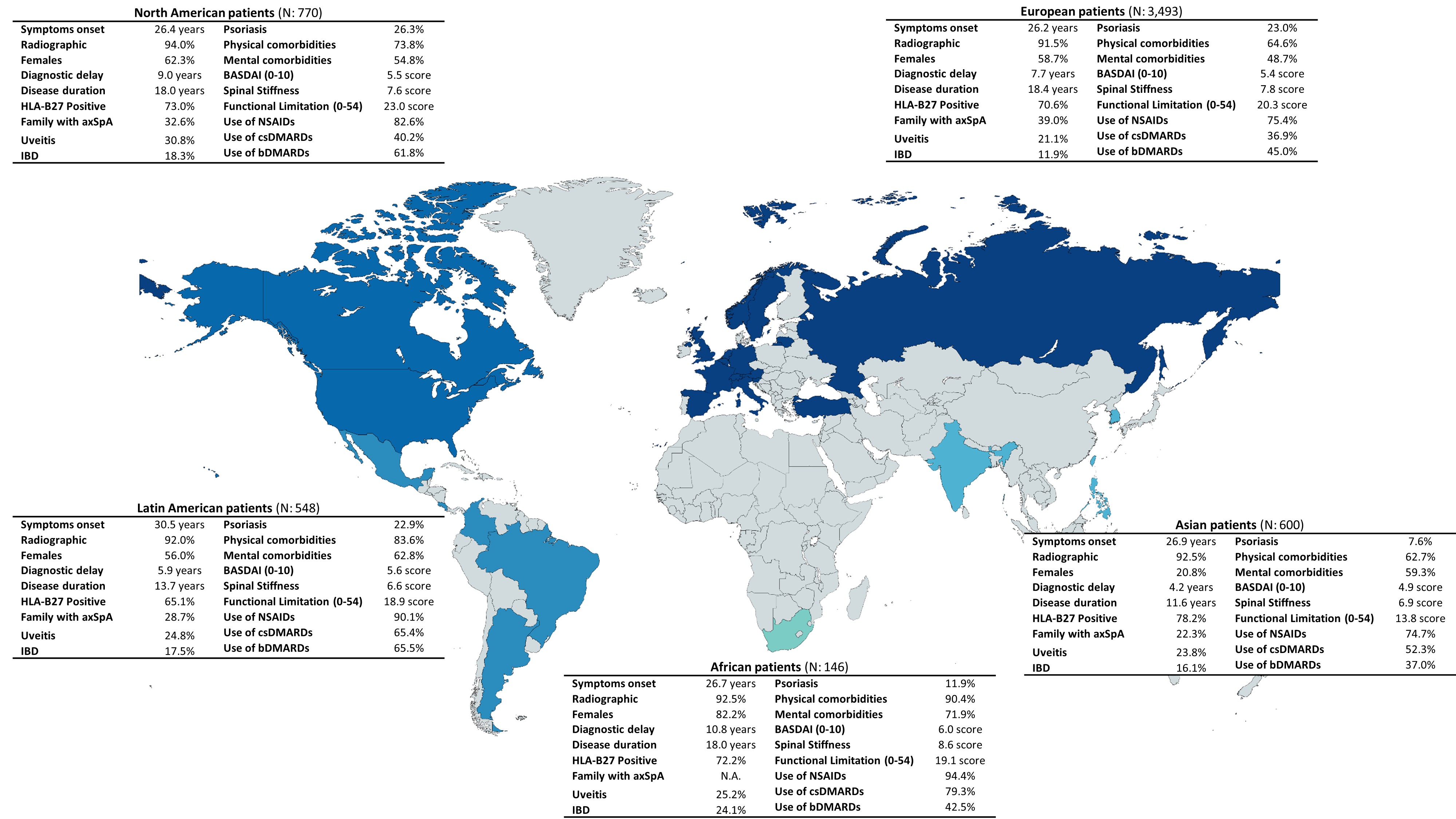 Results: 5,557 patients participated in IMAS survey of which 3,493 were from Europe, 770 from North America, 600 from Asia, 548 from Latin America, and 146 from Africa. Results showed statistically significant differences between regions, except for the classification status (radiographic or non-radiographic). Age at onset of symptoms ranged between 25-30 years, and was higher in Latin America as compared to other regions. Diagnostic delay was longest in South Africa and lowest in Asia. The lowest frequency of HLA-B27 positivity was observed in Latin America and the highest in Asia. Family history of SpA was most often recorded in Europeand less often in Asia. All extra-musculoskeletal manifestations included were lowest in Europe compared with other regions. Physical and mental comorbidities were frequent in African patients and less common in Europe and Asia. Mean disease activity (BASDAI) was 5.4, with highest values in South Africa and lowest in Asia. Spinal stiffness was highest in South Africa and lowest in Latin America. Functional limitation was higher in North America and Europe and lower in Asia. Most of the patients had used NSAIDs for their condition and less than half had ever taken csDMARDS; both were more frequent in Latin America and South Africa. Almost half of the patients had ever taken bDMARDs, more frequent being in the Americas (Map 1).
