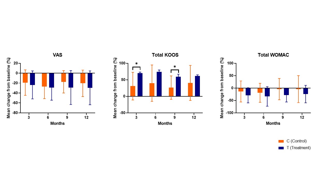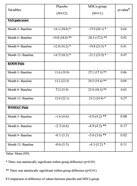 Results: A total of twenty-three patients entered the final analysis, with eleven in MSCs treatment group and twelve in control group. Within group improvement of pain, measured by KOOS and WOMAC, when compared with baseline was statistically significant throughout all time points only in treatment group. Comparison between group differences revealed that treatment group had significantly more improvement of KOOS pain (23.9±18.3 vs 7.2±15.9, p=0.03) and WOMAC pain (-5.0±3.6 vs -0.1±5.5, p=0.02) at 9 months compared with control group. However, the superiority was not sustained until 12 months. In comparison of percentage change from baseline, total KOOS in treatment group had improved significantly compared with control group at 3 and 9 months. The analysis of knee cartilage using MR T2 mapping revealed that the treatment group exhibited a less sharply increase in mean T2 value compared to the control group. Specifically, the mean difference of T2 values between baseline and 12 months was found to be significantly different between treatment group and control group (2.7 ± 13.2 and 5.1 ± 12.8, respectively. p=0.009). Nine patients of treatment group experienced the acute knee pain and swelling relieved by medical treatment, but there were no serious adverse events in all patients.