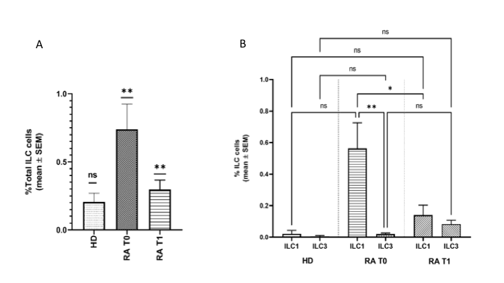 Figure 1: ILCs, ILC1, ILC3 frequencies at T0 and T1 A. Peripheral total ILCs frequency in HD and RA patients at T0 and T1; **p <0,01. B. Frequency of ILC1 and ILC3 in HD and RA patients at T0 and T1; **p <0,01, *p <0,05.