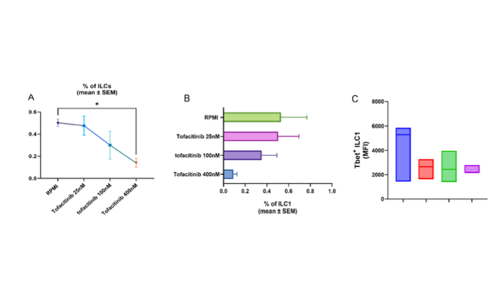 Conclusion: Our preliminary results demonstrate that tofacitinib modulates the innate immune response by reducing the frequency of ILC1 cells and their production of IFN- γ.