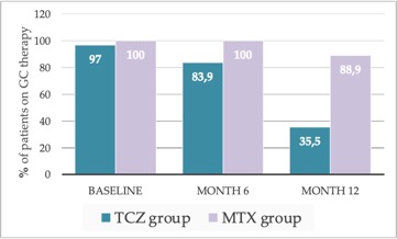 At month 6 after GCA onset, 5/31 (16.1%) patients in TCZ group and none in MTX group were in GC-free sustained remission (p-value=0.001). Similarly, at month 12, 64.5% (20/31) and 11.1% (9/81) of patients were in sustained GC-free remission in TCZ and MTX group, respectively (p-value < 0.001). The median time to discontinued GCs was 10 (IQR 7-12) months (TCZ group) and 24 (IQR 18-45) months (MTX group) (p-value < 0.001).
