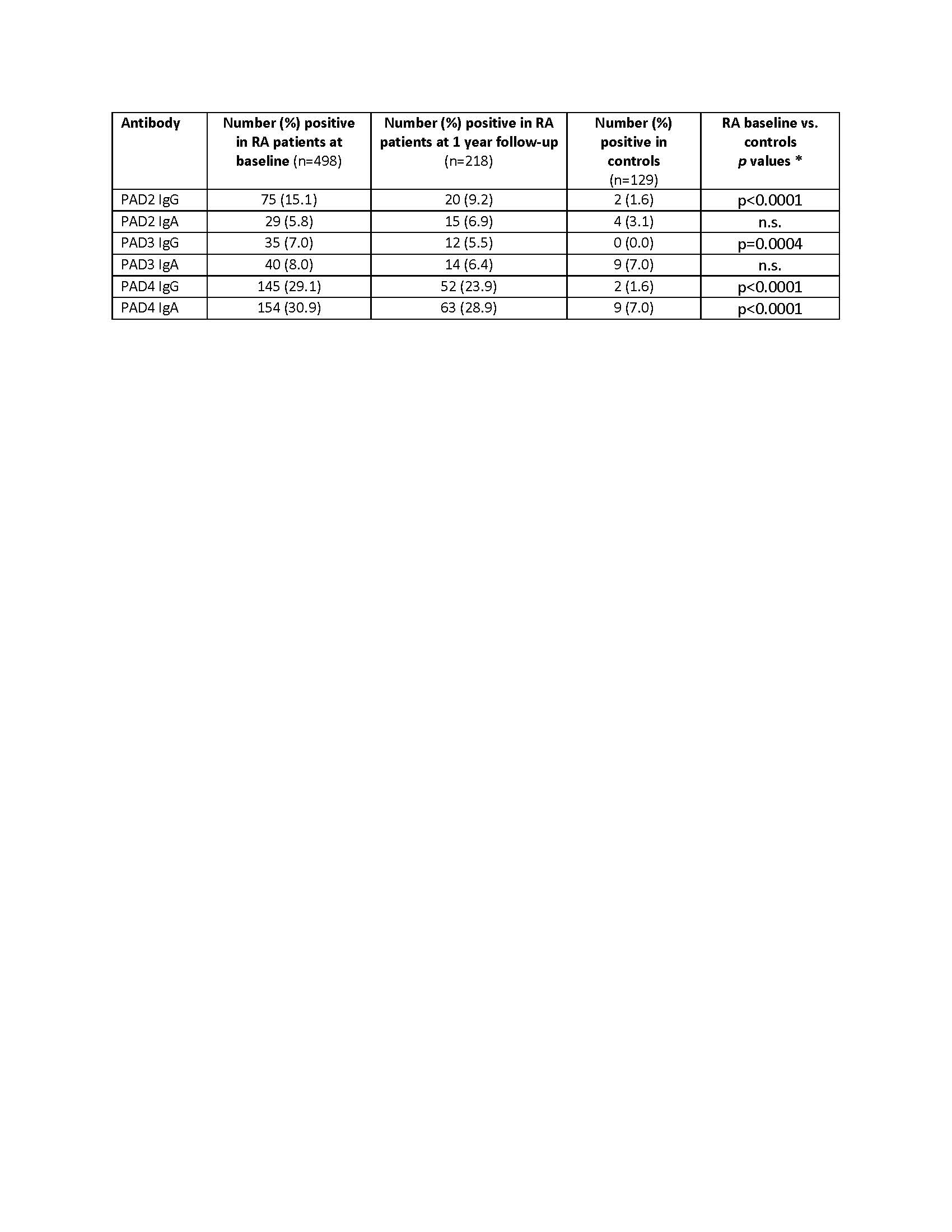 Table 1. Frequency of anti-PAD IgG/IgA antibodies on the RA AMPLE trial cohort and healthy controls. * Fisher exact test, A p-value of <0.05 is considered significant; n.s.: not significant