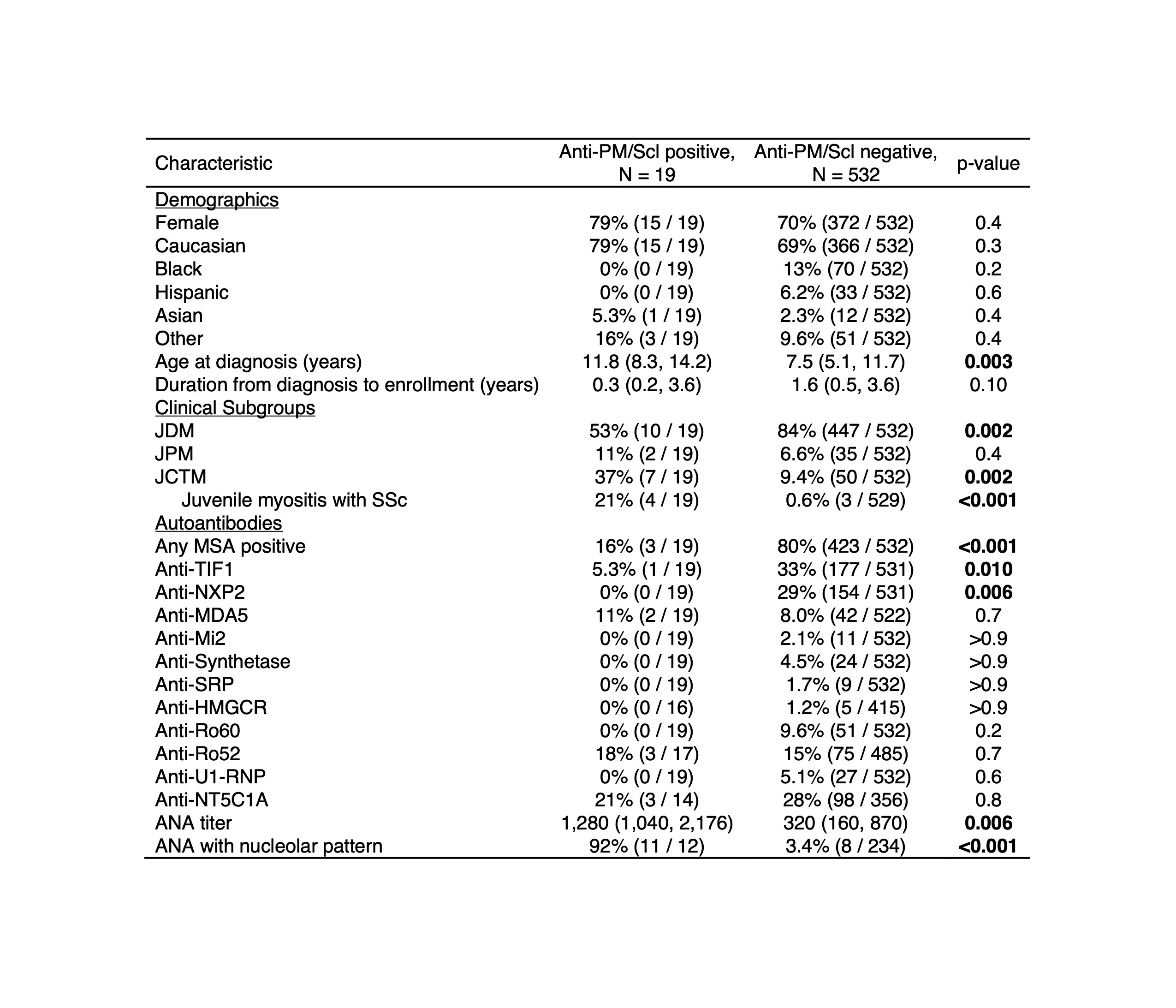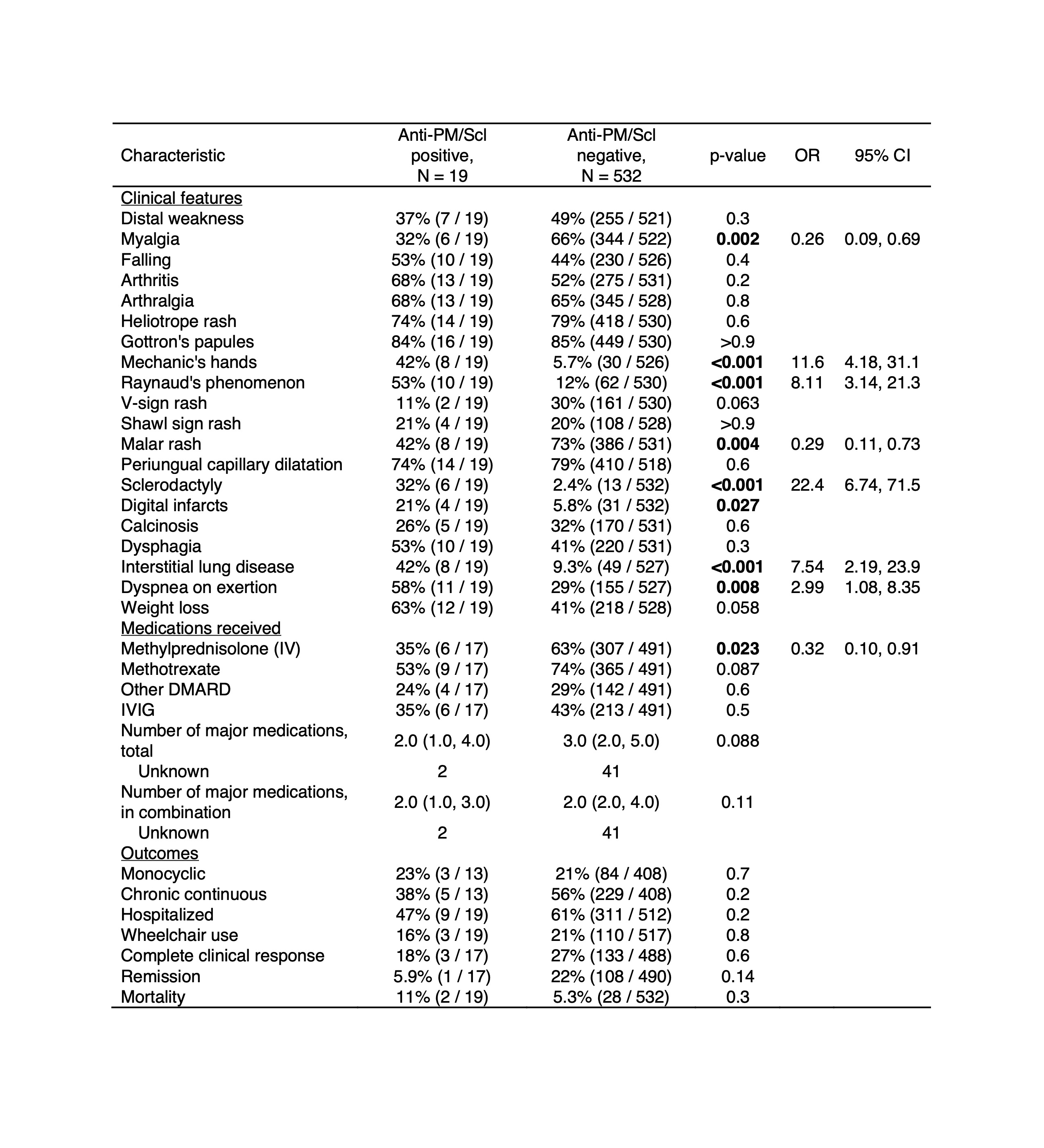 Methods: Patients with juvenile myositis enrolled in NIH myositis natural history studies were screened for anti-PM/Scl and other myositis Abs. Demographics, clinical manifestations, medications, and outcomes of those with and without anti-PM/Scl Abs were compared using Chi-squared, Fisher's exact test, or Wilcoxon rank-sum test. Multivariable logistic regression with adjustment for year of diagnosis and myositis autoantibodies was performed for statistically significant variables from the univariable analyses. A two-sided p< 0.05 was considered significant.