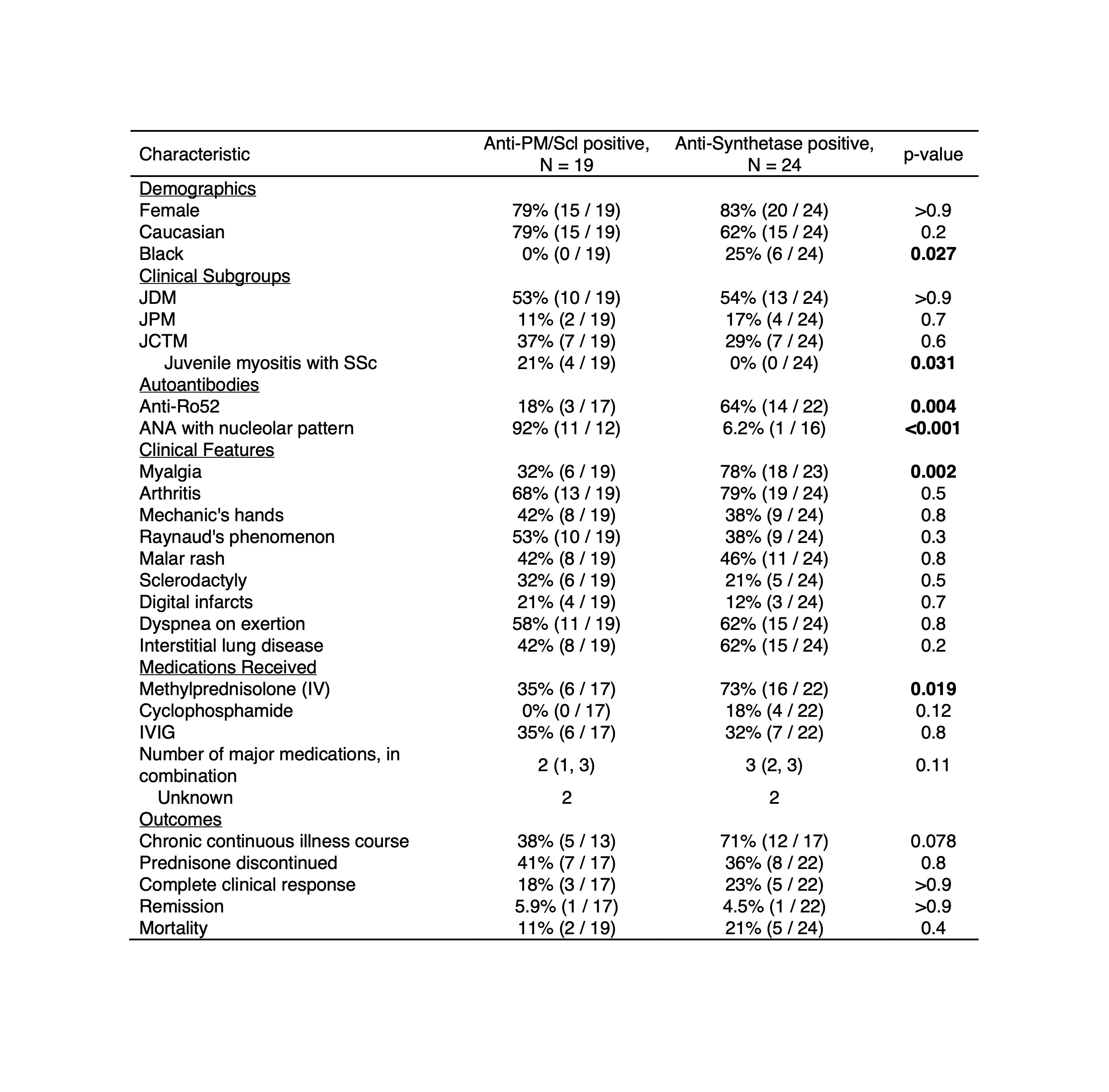 Conclusion: Anti-PM/Scl Abs, unlike other MAAs, were associated with a well-defined phenotype resembling anti-synthetase syndrome. Patients with anti-PM/Scl Abs, compared to those with anti-ARS Abs, were not Black, had an ANA with nucleolar pattern, and less frequently were positive for anti-Ro52 Abs.