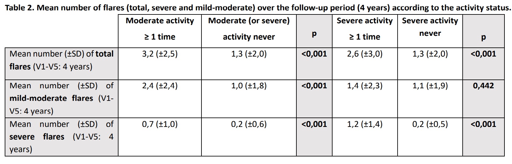 Table 2. Mean number of flares (total, severe and mild-moderate) over the follow-up period (4 years) according to the activity status.