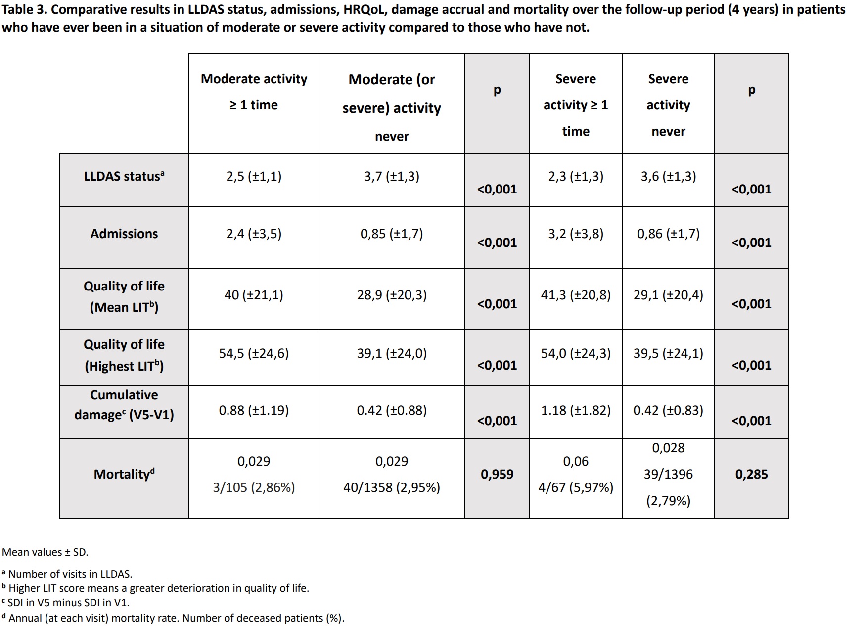Table 3. Comparative results in LLDAS status, admissions, HRQoL, damage accrual and mortality over the follow-up period (4 years) in patients who have ever been in a situation of moderate or severe activity compared to those who have not.