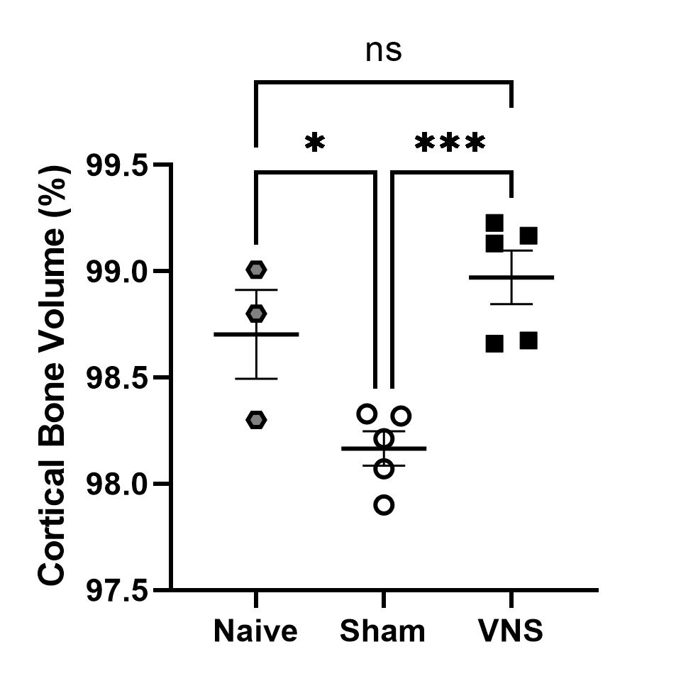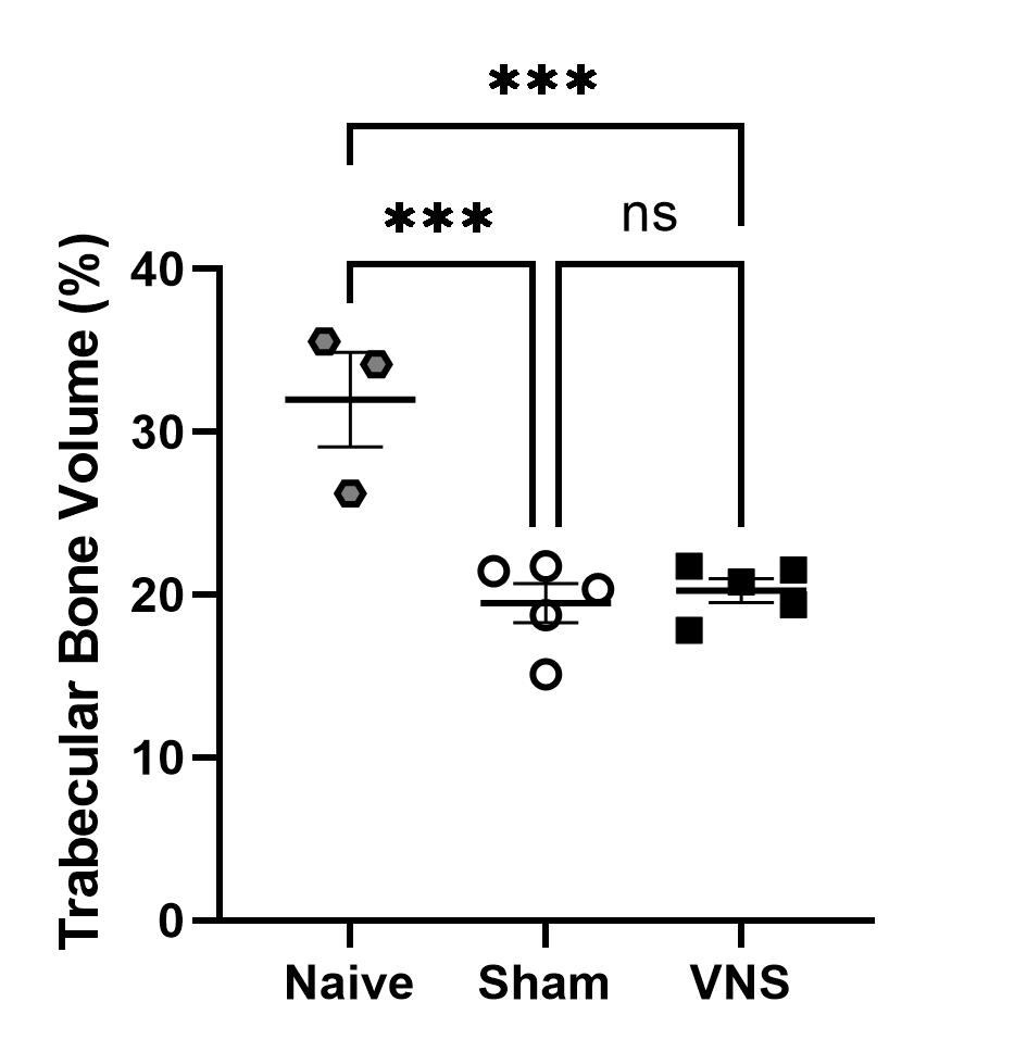 Methods: Vagus nerve stimulation devices (SetPoint Medical, CA) were implanted in 6-week-old female Lewis rats. Following recovery, EAE was induced with myelin basic protein (0.1 mg/rat) and complete Freund’s adjuvant (Hooke Laboratories, CT). Conscious rats (n=5/group) were treated with active or sham stimulation from 7 days post-induction (DPI), the day prior to the typical onset of clinical neurologic symptoms, through 21 DPI. Cortical and trabecular bone parameters were calculated through µCT analysis of the proximal femurs and difference in means compared by ANOVA.