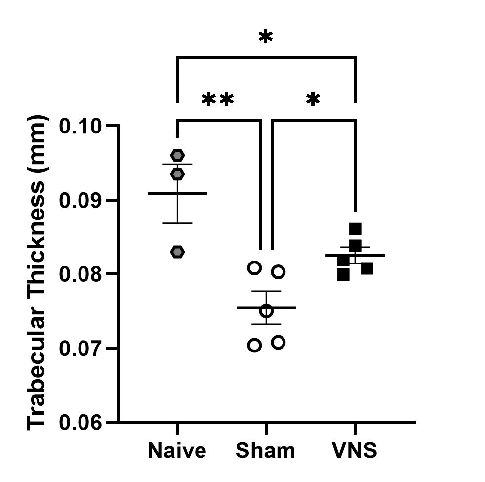 Conclusion: The data show that subacute vagus nerve stimulation enhances trabecular thickness and cortical bone volume in the femurs of rats with EAE. This is an important indicator of a bone-specific protective effect of vagus nerve stimulation, in addition to, and independent of, amelioration of joint-specific inflammation. Studies to further understand of the mechanisms of action are underway.