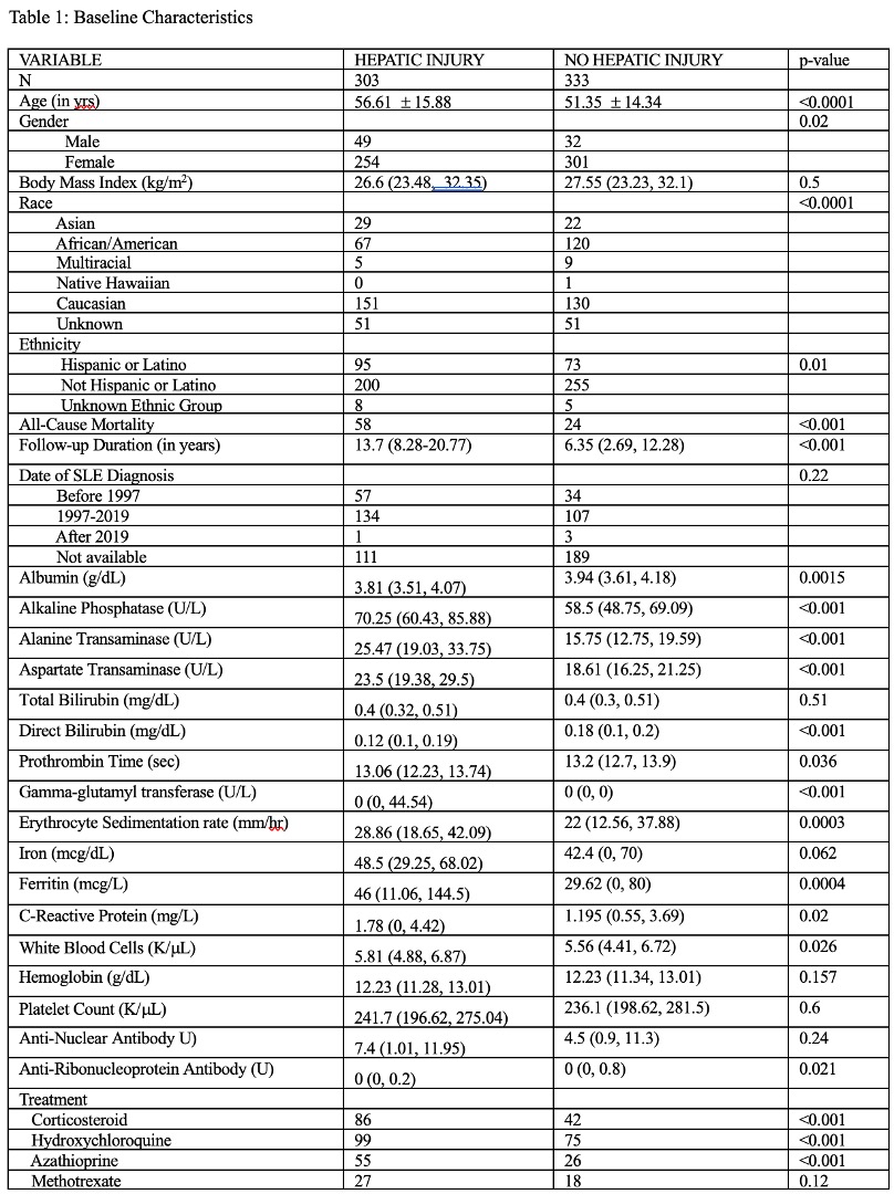 Methods: A retrospective longitudinal single center study was conducted from 1994-2022 to identify patients enrolled in natural history protocol for SLE. Inclusion: 1) Age ≥ 18 years; 2) Diagnosis of SLE based on 1997 American College of Rheumatology revised criteria. Exclusion: Patients with either < 3 visits or < 6 months of follow-up. Demographic, laboratory, medication and liver histology data (when available) were obtained from the electronic medical records. Patients were divided into two categories- with and without HI. HI was divided into 5 categories- persistent hepatocellular injury, transient hepatocellular injury, persistent cholestatic injury, transient cholestatic injury and mixed. Patients were allowed to be in more than one category. Chi-square test and Kruskal-Wallis tests were used for comparing categorical and numerical variables, respectively. P-value < 0.05 was considered statistically significant and R software was used for all statistical analyses.