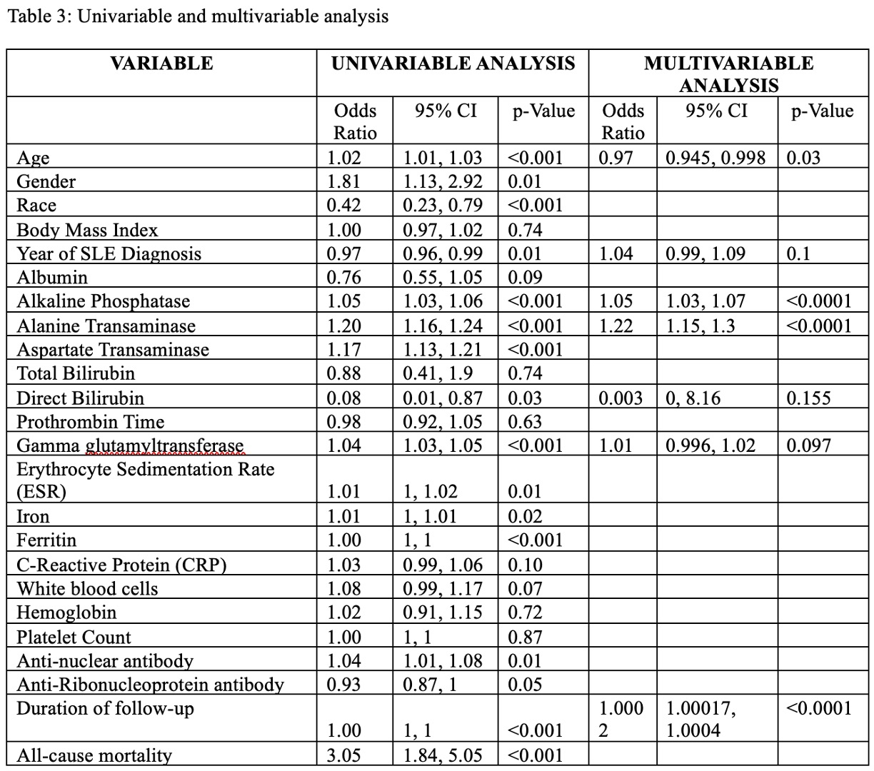Results: Out of 1106 patients, 636 patients were included in the final cohort, with median duration of follow-up of 9.7 yrs (IQR 4.15-16.96). Mean age was 53.85 yrs (±15.31) and majority were females (555, 87.26%). A large proportion of patients (303, 47.64%) developed HI- persistent hepatocellular injury, transient hepatocellular injury, persistent cholestatic injury, transient cholestatic injury and mixed injury were present in 91, 174, 55, 78 and 67 patients, respectively. Patients with HI were older, more likely to be male, Asian, Caucasian or Hispanic and less likely to be African American (Table 1). Patients with HI also had longer follow-up. In majority of patients (230, 75.91%), the cause of HI could not be identified. Of the remaining 73 patients, non-alcoholic fatty liver disease was the most common, followed by drug-induced liver injury, SLE flare and non-alcoholic steatohepatitis (Table 2). On univariable analysis, apart from liver enzymes, age, gender, race, date of SLE diagnosis, duration of follow-up, iron, ferritin, ESR, and ANA were significantly associated with HI (Table 3). However, on multivariable analysis, only alkaline phosphatase, alanine transaminase and duration of follow-up remained associated with higher odds of HI, while older age was associated with lower odds, suggesting patients tend to develop HI at a younger age. All-cause mortality was higher in patients with HI.