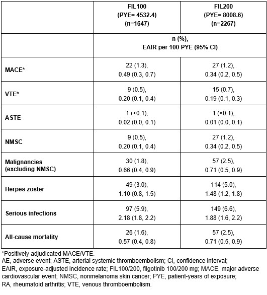 Methods: Integrated FIL RA data from 7 clinical trials are reported: Phase 2 (NCT01888874, NCT01894516), Phase 3 (NCT02889796, NCT02873936, NCT02886728), and the long-term extension studies DARWIN 3 Phase 2 (NCT02065700) and FINCH 4 Phase 3 (NCT03025308). Exposure-adjusted incidence rates (EAIRs)/100 patient-years of exposure (PYE), censored at time of first event, were determined for major adverse cardiovascular event (MACE), venous thromboembolism (VTE), arterial systemic thromboembolism, nonmelanoma skin cancer (NMSC), malignancies excluding NMSC, herpes zoster, serious infections and deaths. Data were as of May 2, 2022 (DARWIN 3) and May 6, 2022 (FINCH 4). MACE and VTE only include positively adjudicated events with a data cutoff of April 3, 2022.