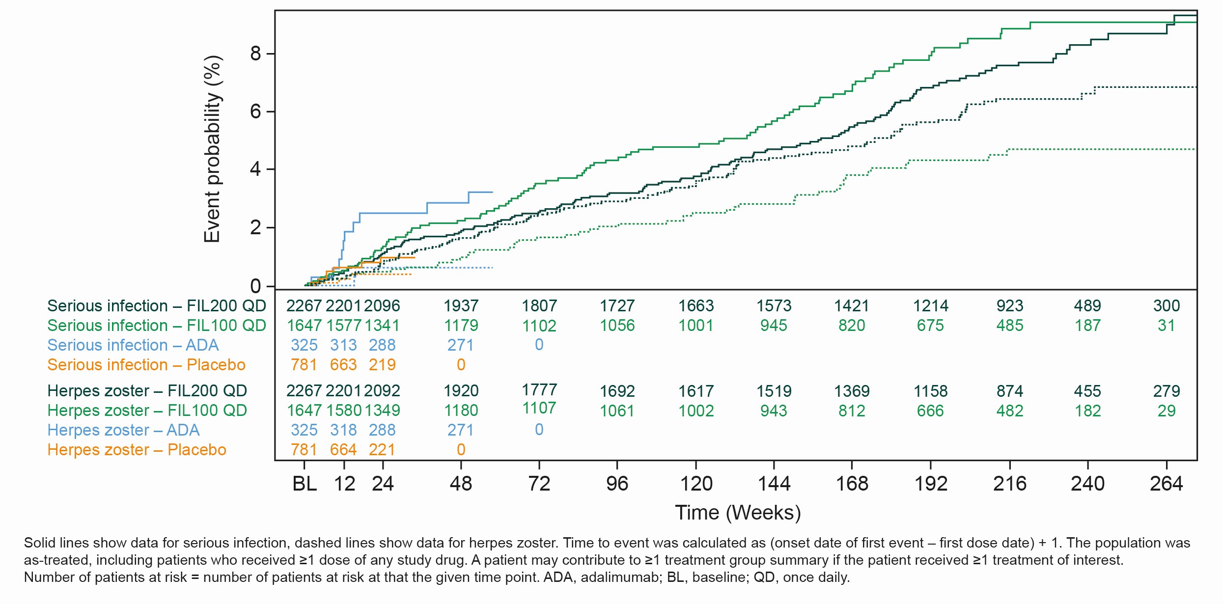 Results: The as-treated population included 3691 patients with 12,541 PYE. Median (max) exposure was 3.8 (8.3) in the pooled FIL group; 3.8 (8.3) years for FIL200 and 3.3 (7.8) years for FIL100. Baseline demographics and disease characteristics were balanced between groups.2 Small numerical differences were observed between FIL doses for EAIRs of selected AEs. Numerically higher incidences of NMSC, herpes zoster and all-cause mortality were reported with FIL200 vs FIL100; incidences of MACE and serious infections were numerically lower with FIL200 vs FIL100, with overlapping confidence intervals (Table). Over 240 weeks, the risks of MACE and VTE were comparable for FIL100 vs FIL200; low event numbers make interpretation difficult. The risk of herpes zoster was higher with FIL200 vs FIL100, and generally similar for serious infection or all-cause mortality (Figure).