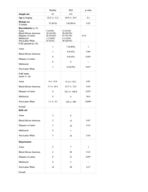 Conclusion: Our preliminary findings describe a multi-ethnic cohort of patients with SLE. CAC was present in 26% of affected patients and 5% of healthy controls. CAC was more prevalent and higher in white patients compared to Black and Latino patients. While hypertension was more prevalent patients with SLE, many other traditional risk factors were not present. We found that Black and Latino patients with SLE had significantly lower mean CAC scores when compared to non-Latino white patients. Our findings may indicate that calcium scores are not as reliable of a risk factor to guide secondary prevention in Black and Latino patients with SLE. It may be that Black and Latino patients have more non-calcified plaque burden when compared to non-Latino white patients with SLE. Further study is needed to examine mechanisms to explain these differences and replicate our findings in larger groups. These findings begin to address CVD health disparities in marginalized populations by providing additional information on SLE-associated CVD in Black and Latino patient