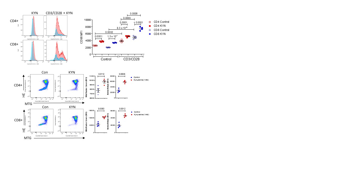 MFIs of CD98 expression in response to KYN only or concurrent KYN and CD3/CD28 stimulation. Metabolic dyes mito-tracker green and hydroethidine dot plots after 72 hour stimulation with KYN and CD3/CD28.
