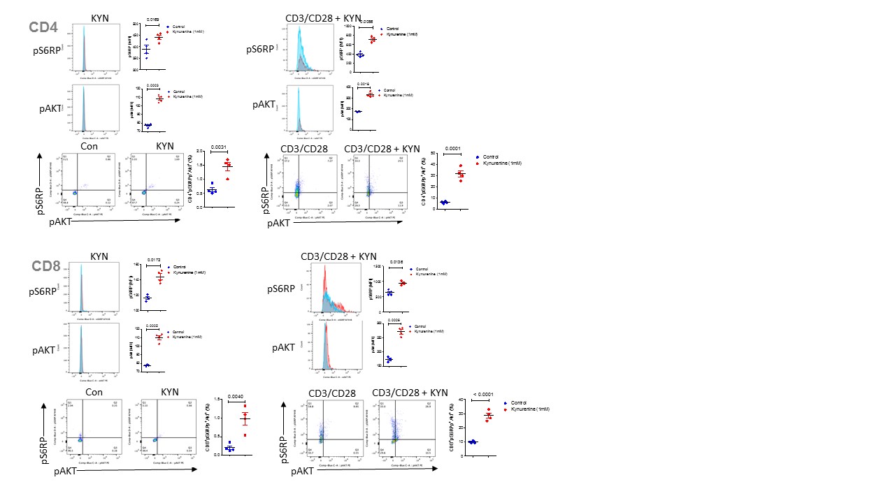 Results: KYN was accumulated in T cells and sera of B6.TC/Rab4AQ72L female mice that exhibited increased expression of CD98 and activation mTORC1 and mTORC2 relative to B6.TC and B6.TC/Rab4AKO controls. In C57Bl/6 splenocytes, KYN increased CD98 expression in CD4 and CD8 T cells (CD4 Unstim: FC=1.48, p=0.00012, CD8 Unstim: FC=1.68, p=2.1E-5, CD4 Stim: FC=1.36, p=0.00069, CD8 Stim: FC=1.51, p=0.00058) and significantly increased both mTORC1 (CD4 Unstim: FC=1.13, p=0.0169, CD4 Stim: FC=1.86, p=0.0086 CD8 Unstim: FC=1.24, p=0.0172, CD8 Stim: FC=1.49, p=0.0136) and mTORC2 (CD4 Unstim: FC=1.41, p=0.0003, CD4 Stim: FC=1.91, p=0.0018, CD8 Unstim: FC=1.42, p=0.0005, CD8 Stim: FC=1.55, p=0.0006). KYN increased mitochondrial mass (CD4 Stim: FC=1.25, p=0.0112, CD8 Stim: FC=1.87, p=0.0053) and ROS production (CD4 Stim: FC=2.2, p=0.0008, CD8 Stim: FC=2.34, p=0.0012) in both CD4 and CD8 T cells following KYN and CD3/CD28-stimulation.