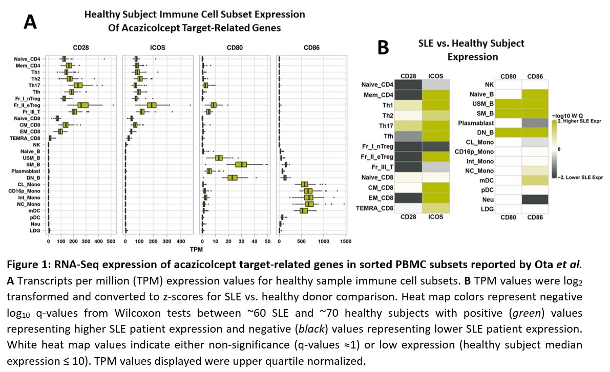 Methods: HD or SLE PBMCs were stimulated with artificial antigen presenting cells expressing CD80, CD86, ICOSL and anti-CD3 (OKT3) for 48h with 100 nM of Fc control protein, acazicolcept, or comparators directed against CD28 (abatacept, [CTLA-4-Ig]) or ICOS (prezalumab [anti-ICOSL mAb]) or combined abatacept/prezalumab. Supernatants and cells were analyzed for cytokine production and gene expression. Acazicolcept was compared in vivo to abatacept (CTLA4-Ig) in a bm12 induced mouse model of lupus4. C57BL/6 recipient mice were treated 2x/wk with acazicolcept or abatacept (N=12), from Days 0-93. Serum anti-double stranded (ds) DNA antibody concentrations were measured, and frozen kidney sections collected on Day 100 wereanalyzed for IgG deposition.