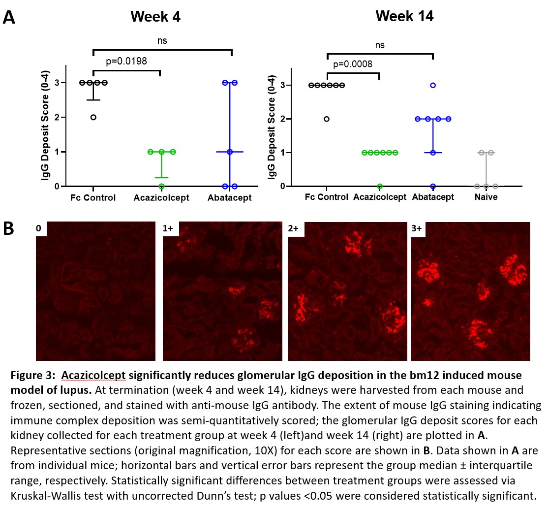 Results: Acazicolcept more potently suppressed expression of genes associated with T cell activation than the abatacept or prezalumab comparators, alone or combined. Gene expression analyses revealed distinct transcriptional profiles between PBMC from HD vs. SLE patients (Fig 1), in agreement with previously published findings. Furthermore, acazicolcept suppressed pro-inflammatory cytokine production and inhibited pathways associated with immune activation including Th1 and Th2 activation and IL-17 signaling (Fig 2). In the bm12 model, acazicolcept significantly reduced serum titers of anti-dsDNA autoantibodies compared to Fc control on Weeks 2 and 6. IgG deposition scores in the kidneys of acazicolcept-treated mice were significantly lower than the Fc control group at Weeks 4 (p=0.0198) and 14 (p=0.0008), while these scores in the abatacept-treated mice were not significantly different than the Fc control group (Fig 3).