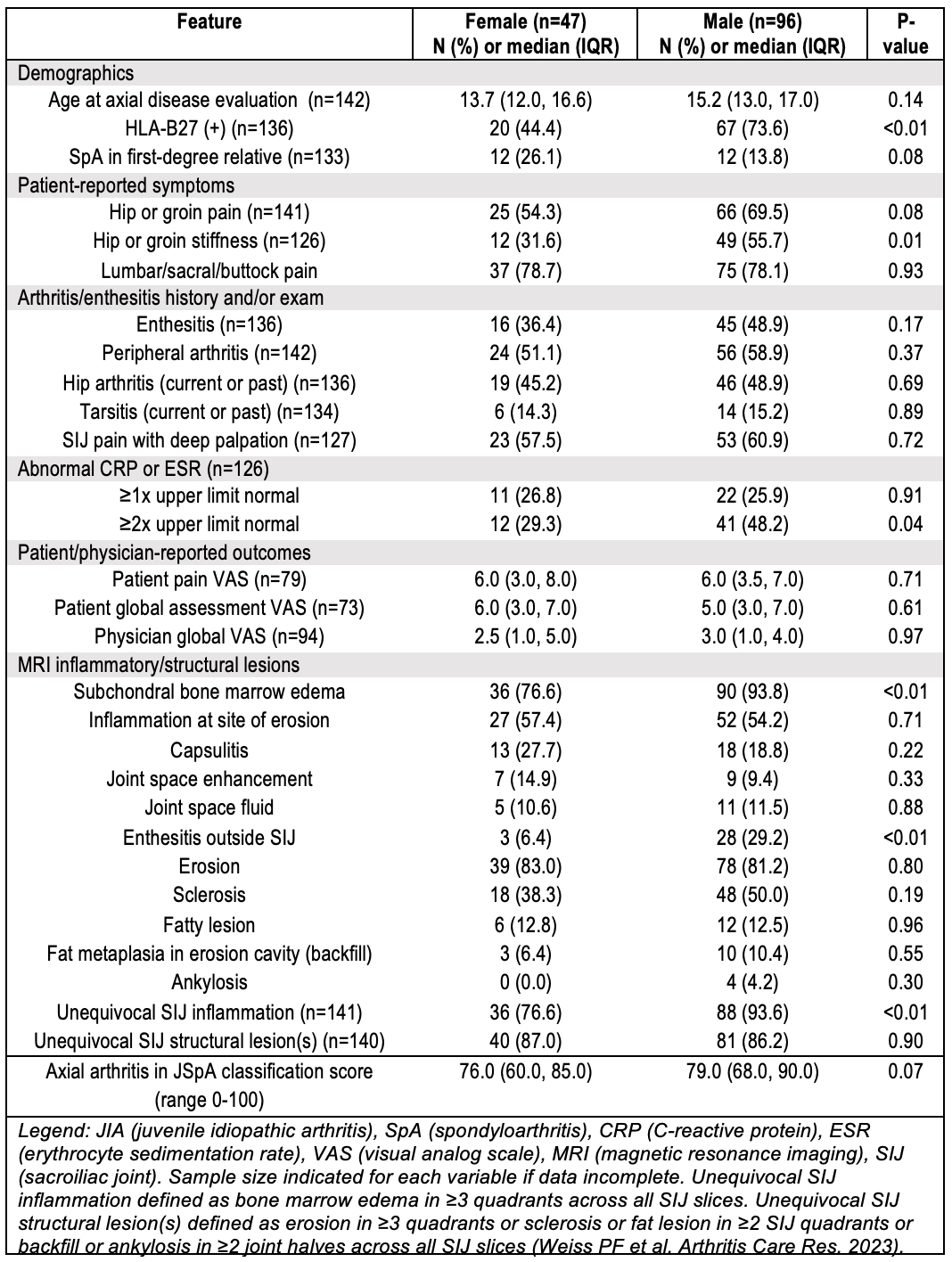 Conclusion: In patients with JSpA who met validated criteria for axJSpA the prevalence of HLA-B27 positivity, and serologic and imaging evidence of inflammation were significantly higher in males than females. Further exploration of the mechanisms underlying these differences is warranted, but our findings suggest that stratification by sex should be considered in the design of future studies in axJSpA.