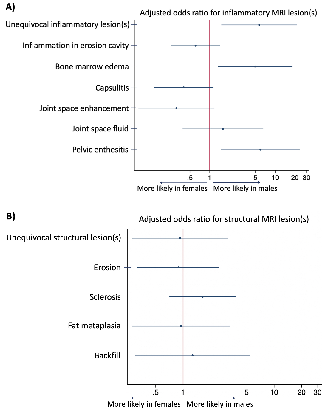 Figure 1. Association of unequivocal (A) inflammatory and (B) structural sacroiliac MRI lesions typical of axial disease and sex, adjusted for HLA-B27 status and degree of inflammatory marker elevation.