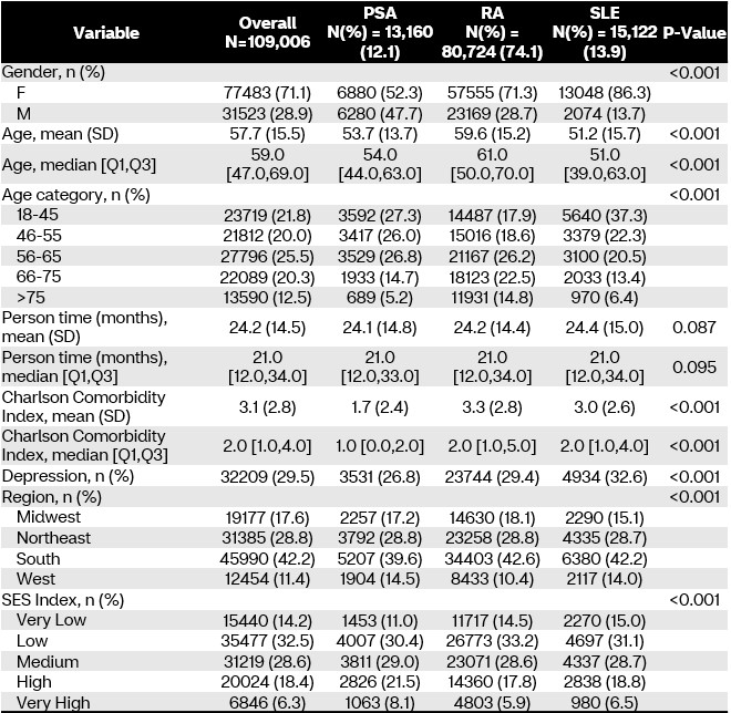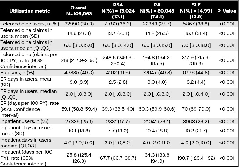 Methods: This was a cohort study of fully insured commercial or Medicare members of a large national health plan between 1/1/2018 and 1/1/2023. Members ≥ 18 years old were included if they had at least 2 visits for RA (ICD-10 code: M05 or M06), PsA (L40.5), or SLE (M32) during the study period. Members were excluded if they did not maintain continuous eligibility for 6 months before or after entrance into the study, had multiple conditions of interest, or had missing socioeconomic status (SES) data. Healthcare utilization metrics were examined as use of telemedicine, emergency room (ER), or inpatient services and were identified by place of service codes on medical claims. ER and inpatient claims were aggregated by day and are presented by days utilizing the service. Utilization rates were calculated based on total person years observed in each cohort and the sum of telemedicine claims. ER days and inpatient days are presented as claims or days per 100 person years observed. Rate differences and rate ratios were calculated with 95% confidence intervals (CI) with direct bivariable cohort comparisons. Continuous variables were assessed with analysis of variance or Kruskal-Wallis tests; categorical variables were assessed with the Chi2 test. P-values < 0.05 are significant, except for cohort comparisons of rate ratios, where the Bonferroni correction was applied and p< 0.005 is considered significant.