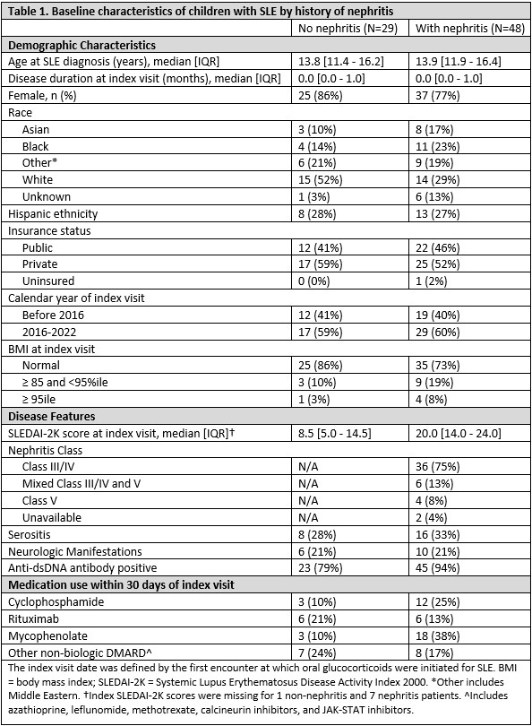 Background/Purpose: Chronic glucocorticoid (GC) morbidity is rarely captured as a standardized clinical outcome in pediatric rheumatic conditions. The pediatric glucocorticoid toxicity index (pGTI) (Brogan et al. 2022) is a new, pediatric-specific tool to measure GC toxicity in research and clinical care. Common clinically important toxicities are organized into domains and weighted according to severity. We used the pGTI to quantify and identify risk factors for GC toxicity in children with pediatric-onset systemic lupus erythematosus (pSLE) with or without lupus nephritis (LN).