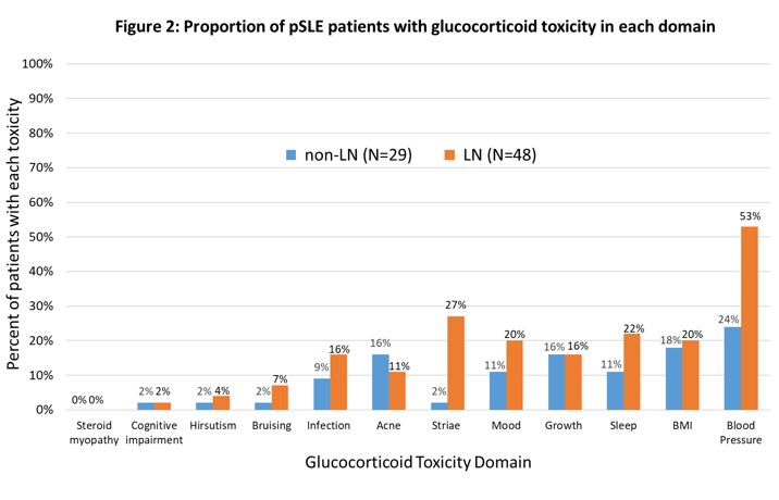 Figure 2. Proportion of patients with pediatric SLE (stratified by presence of LN) with new or worsening toxicity for each pediatric glucocorticoid toxicity subdomain at any time during follow-up.