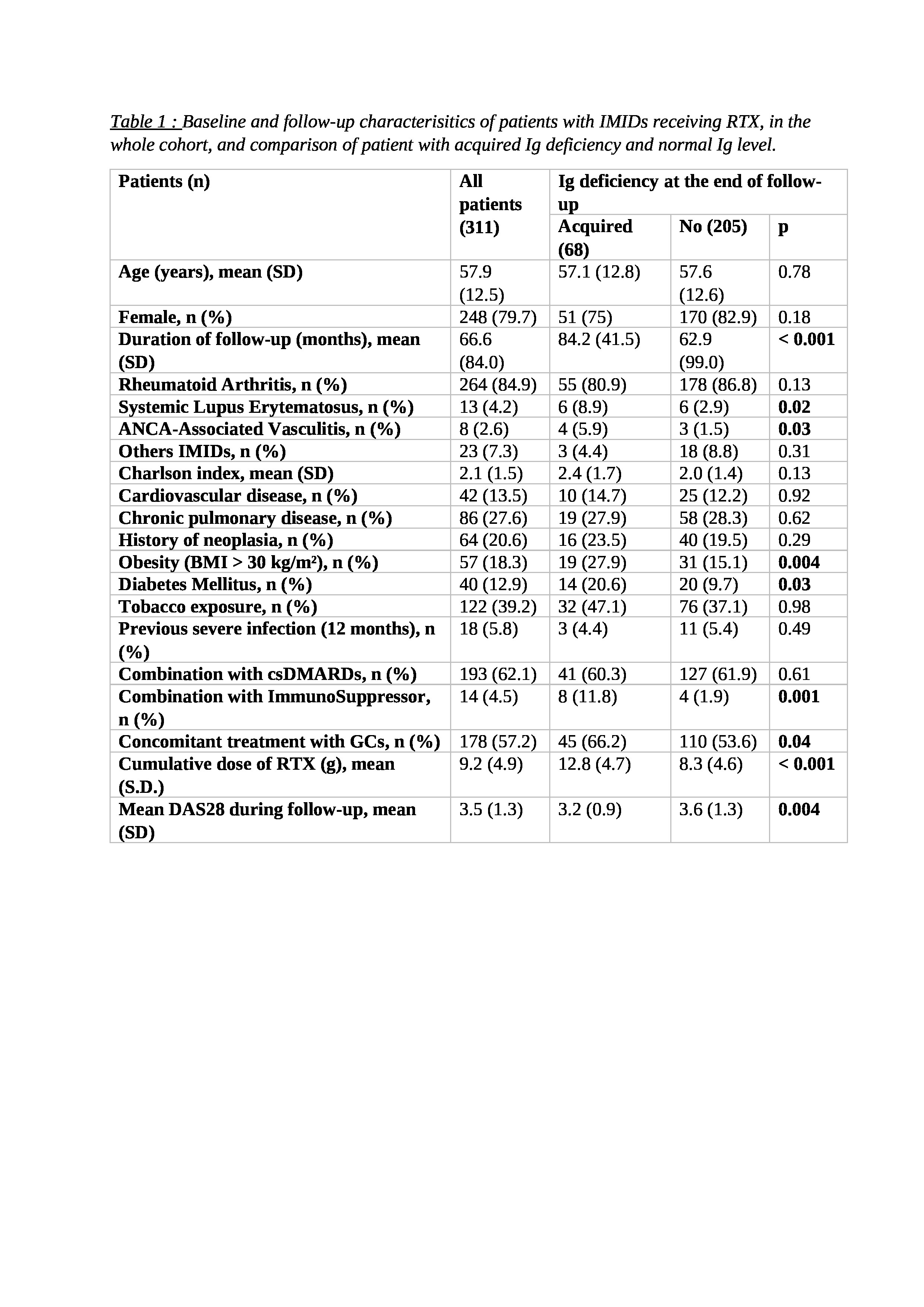 Table 1 : Baseline and follow-up characterisitics of patients with IMIDs receiving RTX, in the whole cohort, and comparison of patient with acquired Ig deficiency and normal Ig level.