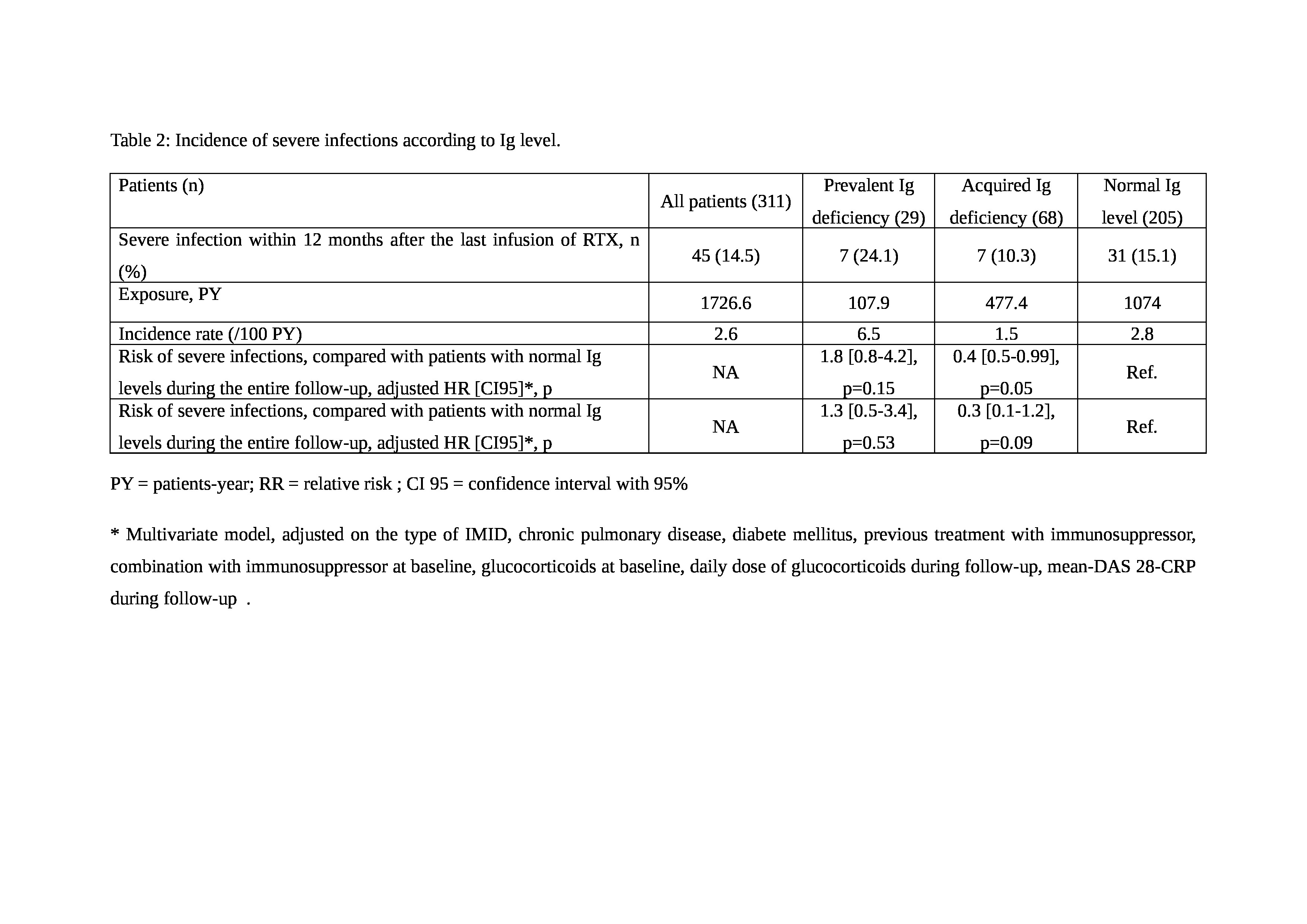 Results: Three hundred and eleven patients were included. Nine patients had undatable Ig deficiency. Twenty-nine patients (9,4%) had prevalent Ig deficiency. As compared with patient with normal Ig level at baseline, concomitant treatment with glucocorticoids (p=0,03) and with a higher daily dose at baseline (p=0,01) were associated with a prevalent Ig deficiency. Sixty-eight patients (22,0%) acquired an Ig deficiency after the first infusion of RTX. A longer time of follow-up and a higher cumulative dose of RTX, the type of IMIDs (SLE and AAV) and concomitant treatment with IS or GCs at baseline, diabetes mellitus and obesity were associated with the occurrence of an Ig deficiency (Table 1). Forty-three patients (14,3%) developed a severe infection within 12 months after the last infusion of RTX. Severe infections occurred more frequently in patients with prevalent Ig deficiency but without any stastistical difference with patient with normal Ig level (Table 2). In multivariate analysis, only chronic pulmonary disease, a higher daily dose of GCs and a higher mean DAS28-CRP during follow-upwere still associated with an increased risk of severe infection (Table 3). In a time-dependant analysis, Ig deficiency in patient treated with RTX, wether acquired or prevalent, was not associated with an increased risk of severe infection (adjusted HR 1.04 [0.5-2.3], p=0.92).