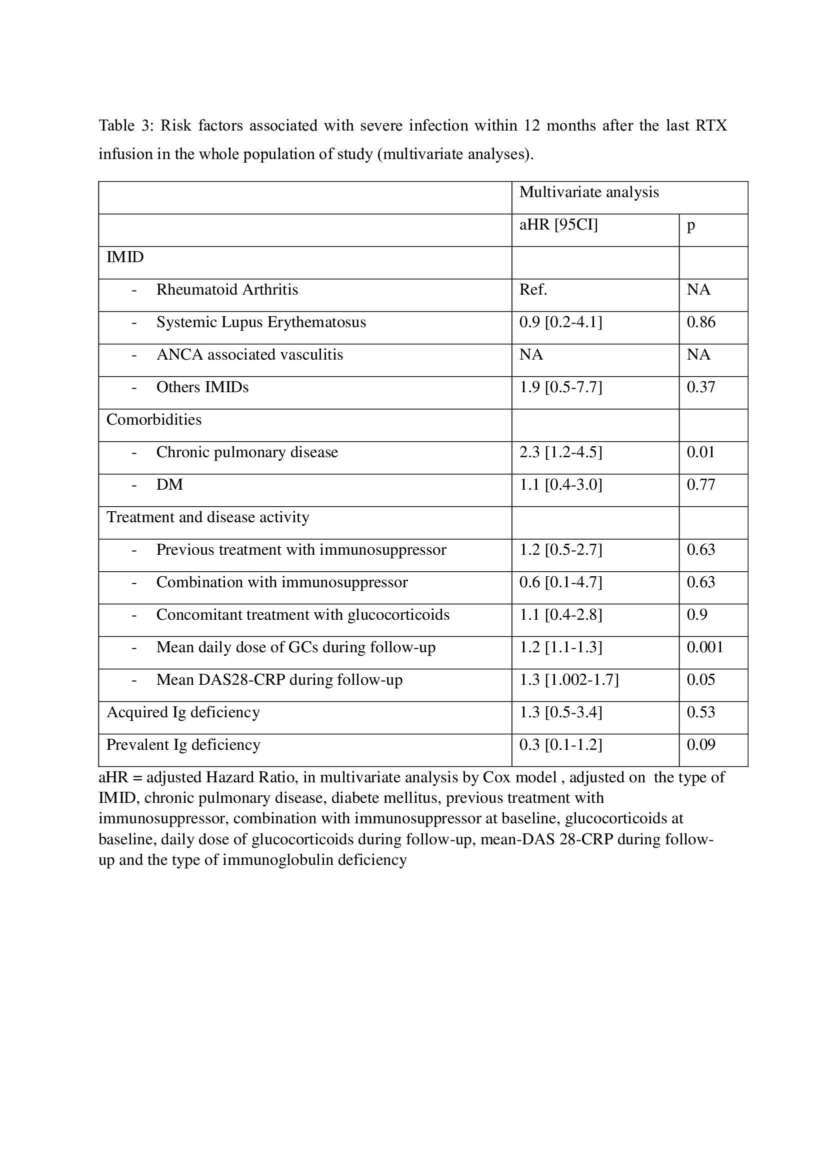 Table 3: Risk factors associated with severe infection within 12 months after the last RTX infusion in the whole population of study (multivariate analyses).