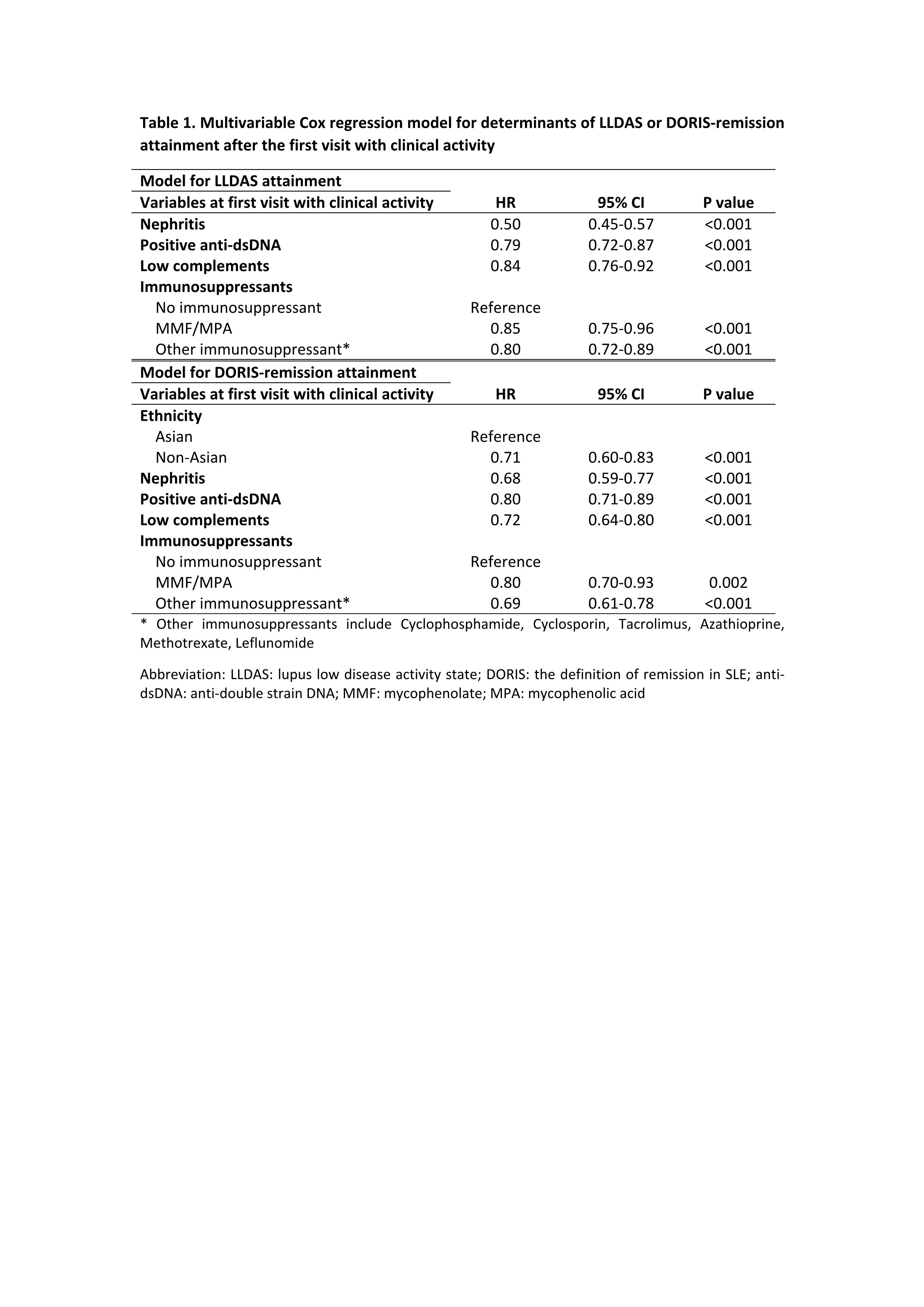 Results: 2852 patients (92.4% female) were followed for a median of 3.3 (1.1-5.7) years. The mean (standard deviations) SLEDAI and PGA at the first visit with clinical activity were 7.0±4.3 and 0.9±0.7, respectively. 1858 (65.2%) of the patients achieved LLDAS, with median (interquartile ranges) time to first attainment of LLDAS being 0.5 (0.3-1.2) years (Figure 1). The proportion and median time to first attainment of DORIS-remission were 49.3% and 0.7 (0.4-1.6) years, respectively. Multivariable Cox model showed that nephritis, positive anti-dsDNA and low complement were associated with a longer time to attainment of LLDAS and DORIS-remission, and in addition non-Asian ethnicity was associated with a longer time taken to attain DORIS-remission (Table 1). After the first attainment of LLDAS, 887/1852 (47.9%) of patients experienced flare(s) with a median time to first flare of 0.7 (0.3-1.4) years. 679/1405 (48.3%) patients had flare(s) after the first attainment of DORIS-remission within a median time of 0.8 (0.3-1.6) years (Figure 1). In multivariable GEE model, factors associated with flare post attainment of LLDAS included tapering of corticosteroids and immunosuppressants (Table 2). 110/960 (11.5%) and 77/750 (10.2%) patients had damage accrual within 24 months of first attainment of LLDAS and DORIS-remission, respectively (Figure 1).