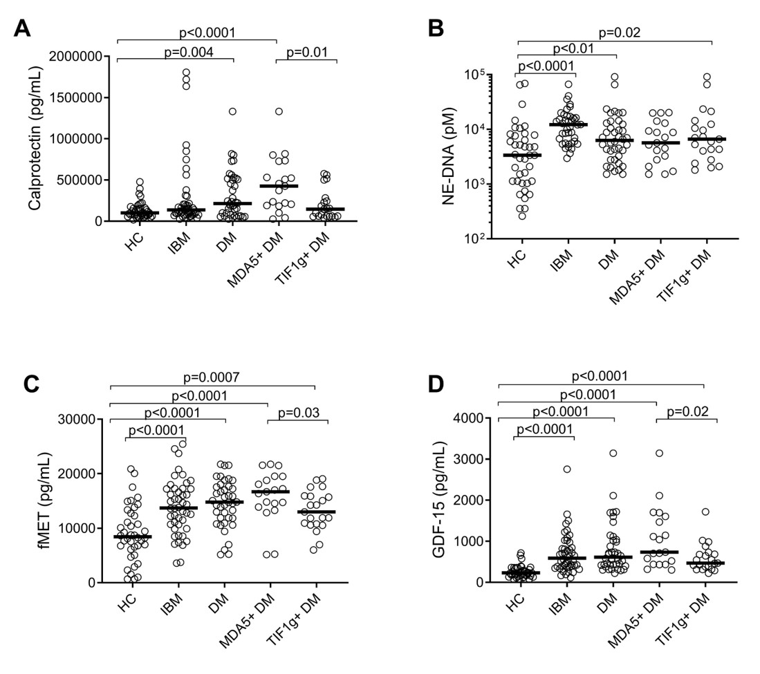 Methods: Plasma samples were obtained from patients with inclusion body myositis (IBM, n=46), dermatomyositis (DM, n=40), and healthy individuals (HC, n=40) from Karolinska Institutet, Stockholm, Sweden; Johns Hopkins, Baltimore, USA; and University of Washington, Seattle, USA. DM patients were further categorized based on the presence of autoantibodies towards MDA5 (n= 19) and TIF1-gamma (n=21). Plasma levels of neutrophil-derived calprotectin and neutrophil elastase (NE)-DNA complexes, as well as mitochondrial-derived GDF-15, and N-formyl methionine (fMET), which are valuable indicators of potential mitochondrial driven-pathological processes, cellular stress, and/or tissue damage, were measured using ELISA. Statistical analysis was performed using GraphPad Prism 9.4.0.