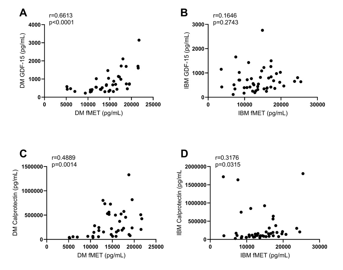 Results: Calprotectin levels were significantly elevated in DM patients, with the highest concentrations observed in those with MDA5 subtype (Figure 1A). Patients with IBM had similar levels of calprotectin as compared to HC. In contrast, levels of neutrophil extracellular traps, NETs (NE-DNA), were elevated in both DM and IBM patients, as compared to HC (Figure 1B). Both IBM and DM patients exhibited higher levels of mitochondrial-derived fMET and GDF-15 as compared to HC (Figures 1C and D), supporting a role for mitochondrial dysfunction and extrusion in these myopathies. Levels of GDF-15 and fMET were strongly correlated in DM but surprisingly no association was found in IBM (Figures 2A and B). Of note, consistent with other inflammatory conditions, levels of mitochondrial-derived fMET correlated strongly with neutrophil activation marker calprotectin in both IBM and DM (Figures 2C and D) suggesting that similar mechanisms, e.g. activation of neutrophils through fMET receptor FPR1, may operate in these subgroups of myopathies.