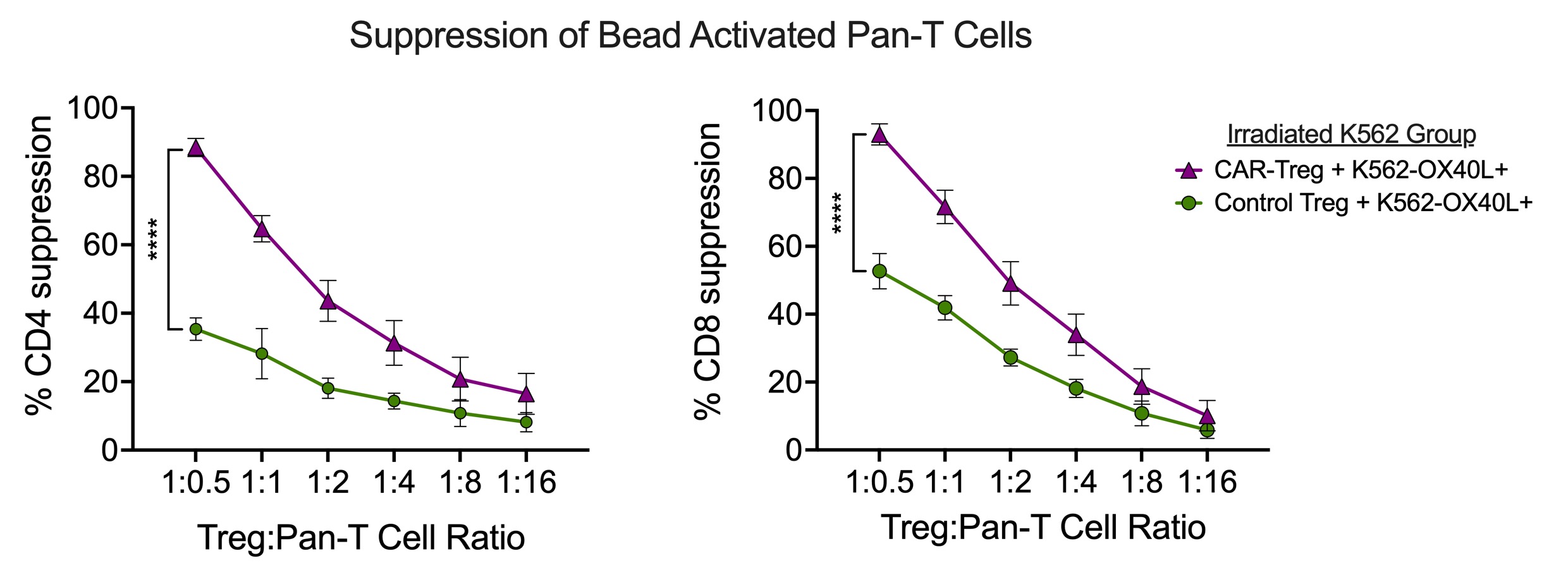 Figure 2: Superior T cell suppression by CAR-Tregs. CAR-Tregs exhibited a superior in vitro capability to suppress anti-CD3/CD28 mAb (bead) mediated CD4+ (left) and CD8+ (right) T cell proliferation. Tregs were co-cultured with irradiated OX40L+ K562 cells for one day prior to assay. Percent suppression was calculated based on cell division, comparing the ‘with Treg’ to the ‘no Treg’ conditions.