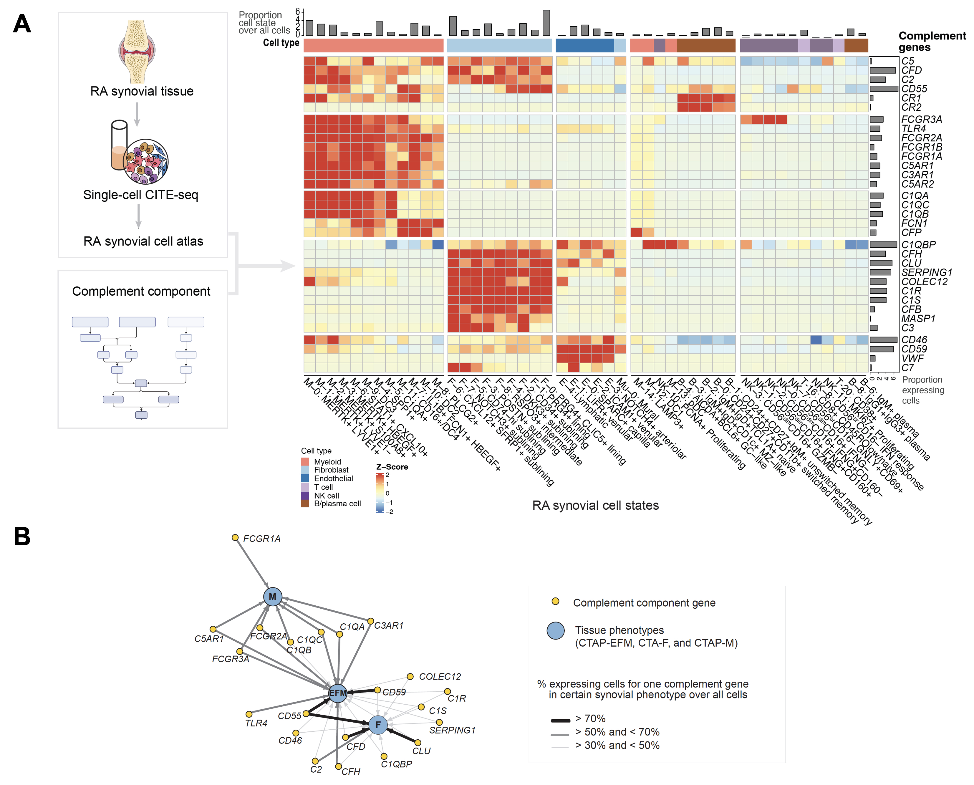 Fig. 1. Single-cell expression distributions of complement components across cell types in rheumatoid arthritis synovial tissues (A). Different myeloid, fibroblast and endothelial cell states express different complement components. Relationship between complement components and RA synovial tissue phenotypes (B).