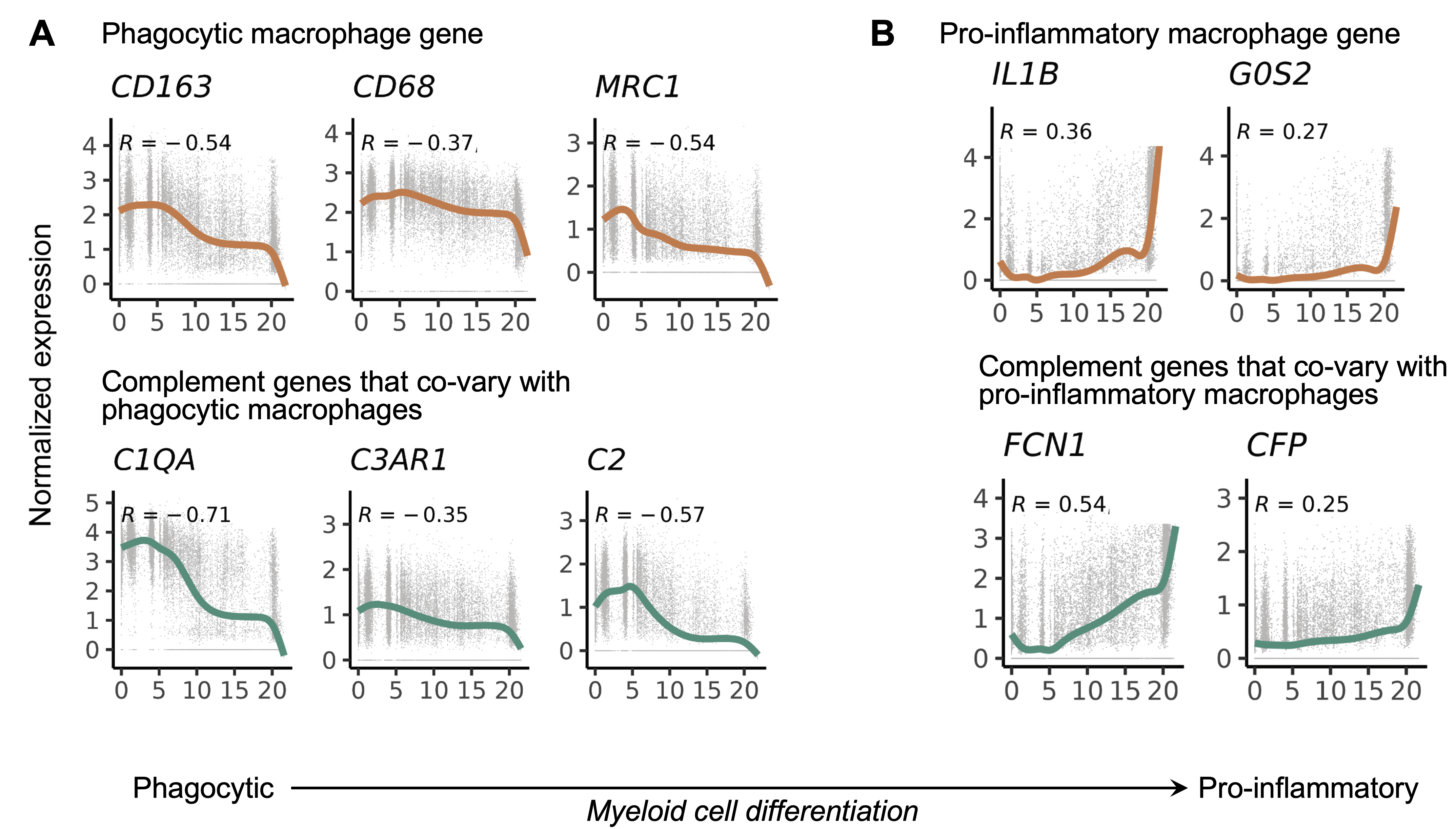 Fig. 2. Myeloid-specific single-cell trajectory analysis revealed a myeloid cell differentiation trajectory from phagocytic to pro-inflammatory lineage. Complement components C1QA-B, C3AR1, and C2 expressions correlated with anti-inflammatory/phagocytic functions (A); complement components FCN1 and CFP expressions correlated with pro-inflammatory function (B). Spearman correlation R and p-value are shown.