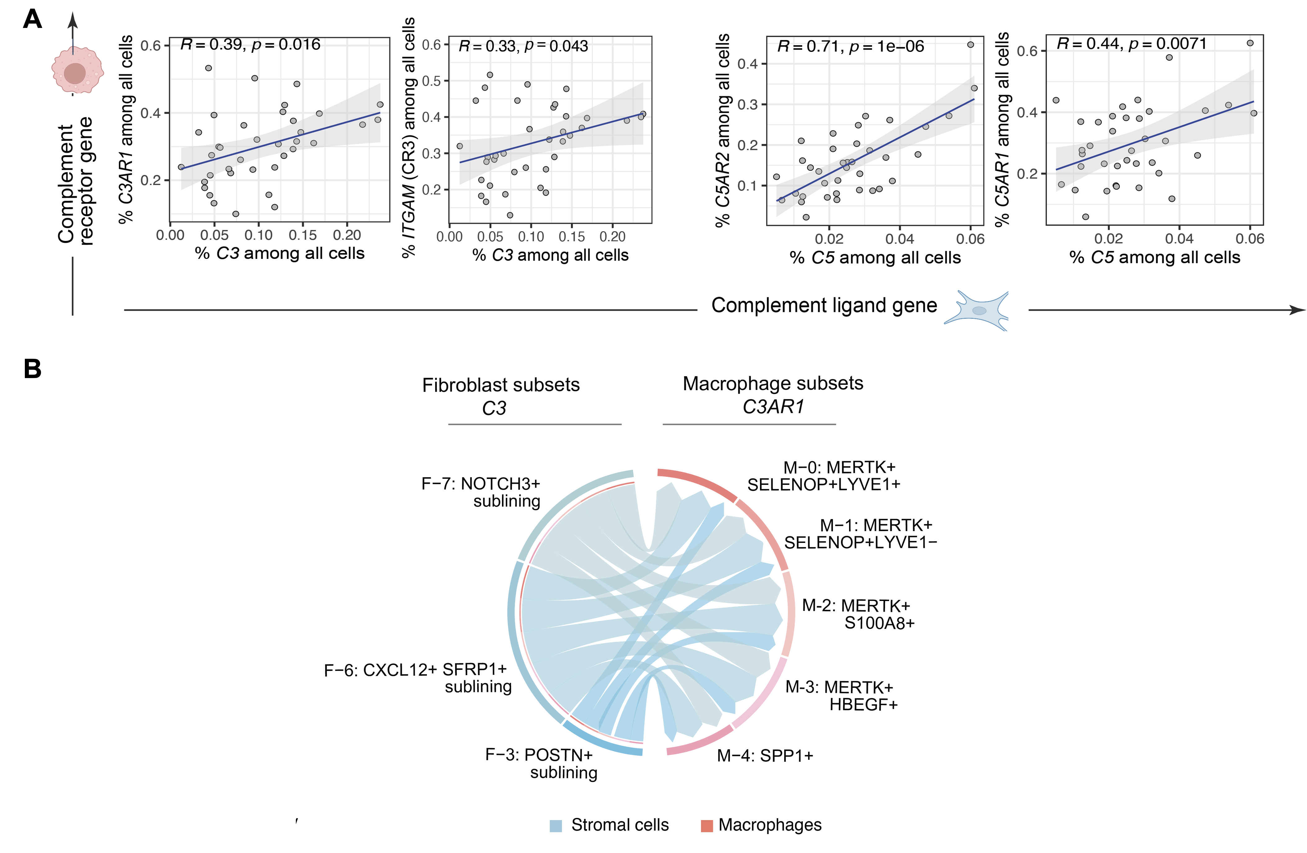 Fig. 3. Across cell type analyses revealed complement-development receptor-ligand correlations (A) and potential complement pathway-dependent C3+ sublininig fibroblasts and MERTK+ tissue macrophages interacting patterns in stratified RA tissues (B). Spearman correlation and p-value are shown.